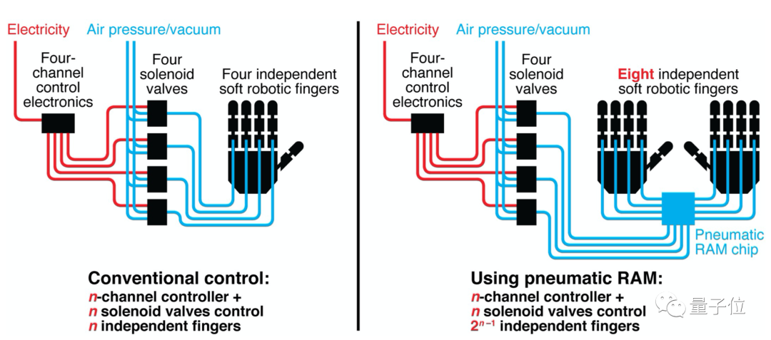 与传统电路中单个通路控制单个执行器不同,使用气动RAM可以用n个通路控制2的n-1次方个执行器。