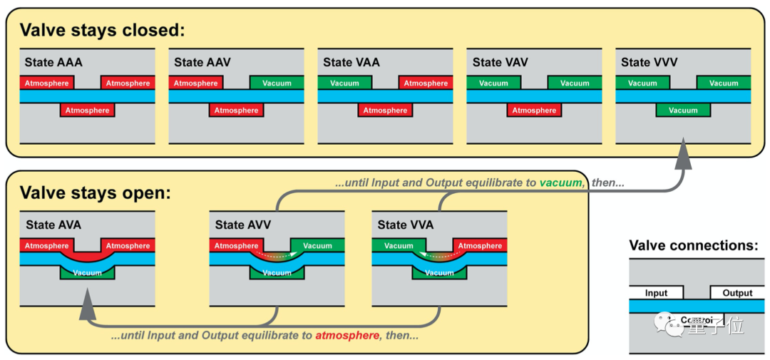 能够实现记忆、维持机器人执行器状态,主要靠的就是这个微流控阀,它最初是被用在微流控芯片上控制液体流动,这些阀门能够在气流供应断开时,仍旧保持压力差存在。