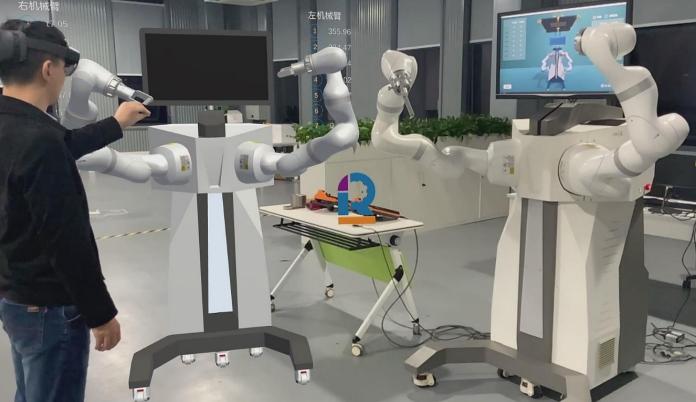 MR是虚拟现实技术的进一步发展,该技术通过在现实场景呈现虚拟场景信息,在现实世界、虚拟世界和用户之间搭起一个交互反馈的信息回路。现结合MR操控的研究对MR眼镜进一步开发,实现机器人实时状态监测和机器人实时同步运动,在机器人云操控教学以及专家远程协同等方向具有广泛的应用市场。