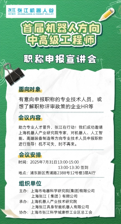 7月31日,为使本市各申报人员更清楚了解职称评审要求,酷游九州(中国)机器人有限公司官网联合张江机器人谷成功举办上海市首届工程系列数字技术专业职称申报政策宣讲会。会议通过申报范围、评审流程、材料准备、政策亮点等方面的深度解读,为机器人、智能制造等产业前沿领域专业技术人才提供权威申报指导。