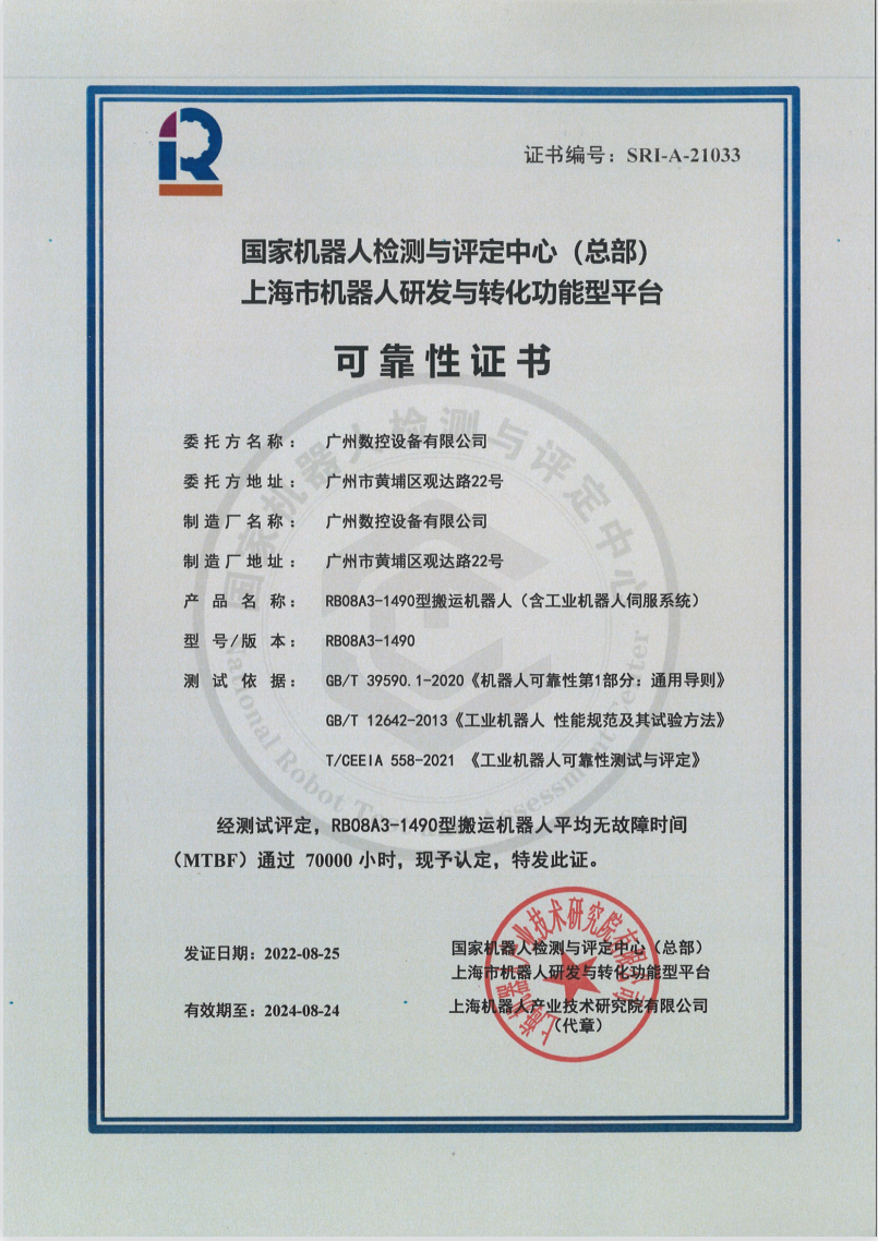 近日,广州数控设备有限公司(以下简称广州数控)RB08A3系列搬运机器人顺利通过了酷游九州(中国)机器人有限公司官网的 MTBF 70000小时测评。